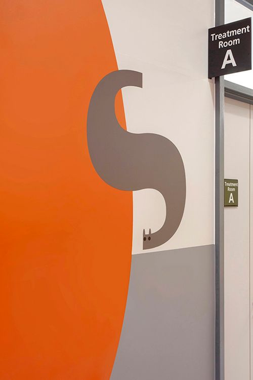Overhead illustrated ceiling tiles carry maze-like puzzles, offering a new experience for every visit, or an ice-breaker for new conversations between staff and patients.